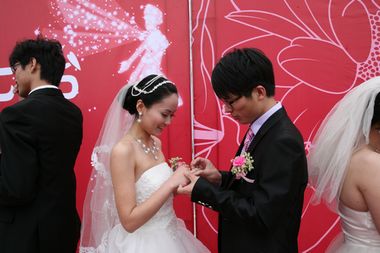 婚礼现场,一对对新人将写满爱情祝福的气球放飞天空,并在现场所有领导、嘉宾及亲朋好友的见证下交换爱情信物,深情相拥。同时,喜结连理的16对新人还受到了在场公司各界代表的美好祝福。最后,公司及团市委领导为新人们派发蜜月游的奖品,把整个婚礼活动现场推向了高潮!