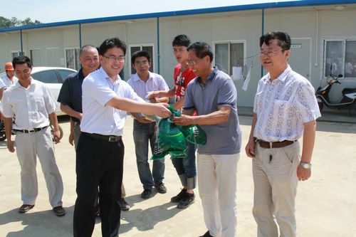7月5日,中国十七冶集团副总经理、工会主席方荣华在工会副主席、组织文化部部长杨绍凤的陪同下,深入马鞍山11个保障房项目,为各项目送去绿豆、白糖和茶叶等防暑降温物品。