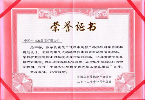 日前,从安徽省环保厅产业协会获悉,中国十七冶集团荣获2012年度“安徽省环境保护优秀施工示范单位”称号。