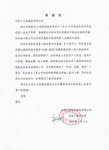 6月4日,江阴兴澄特种钢铁有限公司向中国十七冶集团致感谢信,感谢冶金工程技术公司在该公司50万吨高速线材项目的建设中做出的突出贡献,同时也对我公司在该项目中取得的业绩表示祝贺。
