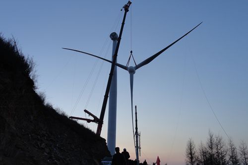 428傍晚,由中国十七冶集团风力与太阳能发电工程技术公司承建的华润新能源天镇神头山风电工程首台风机顺利吊装完成。