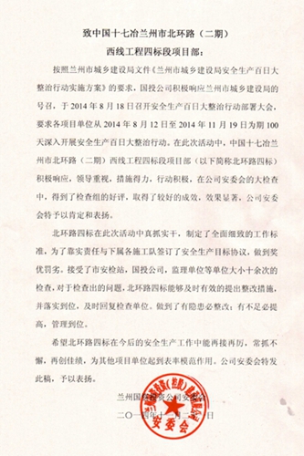 日前,中国十七冶集团路桥工程技术公司兰州北环路(二期)西线工程四标段项目经理部收到了兰州国资投资公司安委会发来的表扬信,表扬项目部在深入开展安全生产百日大整治行动中所取得的显著成效。