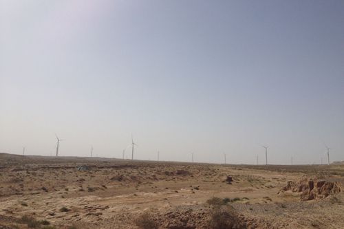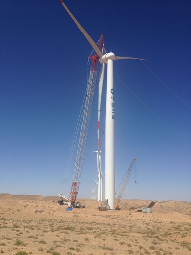 该项目位于甘肃省金昌市以北18公里处的金川区双湾镇红山梁、红崖山地区。风场位于西北戈壁滩上,总装机容量为99MW,共安装66台单机容量为1.5MW风力发电机组,我公司负责所有风机的安装任务。
