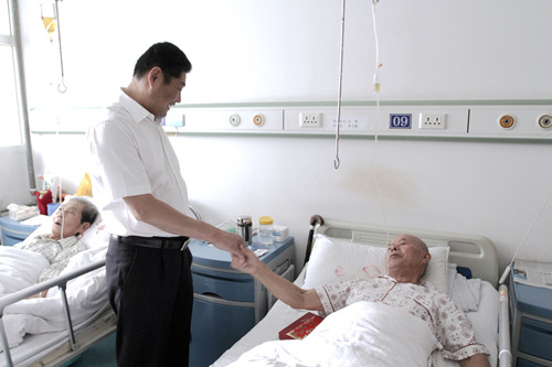 随后,喻世功董事长来到十七冶医院看望86岁高龄的抗战老战士邱传海。得知喻董事长到来,躺在病床上的邱老非常高兴,紧紧拉住喻董事长的手,不停地道谢。喻世功董事长询问了老人的身体状况,得知老人在医院受到了很好的照顾,心里非常高兴。喻董事长嘱咐身边的医务人员要精心照顾好邱老,祝老人早日康复。