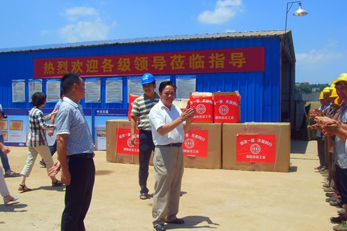 尽管烈日当空,在项目部预制场施工现场,依然是一幅繁忙的工作景象。王建之主席与“情系职工送清凉”慰问组的到来,为高温天气中仍然奋战在一线岗位的工作者送来了清凉和关怀。在施工现场,王建之主席详细了解项目建设进展情况,询问了项目部目前农民工数量、管理措施等,并与员工们一一握手,将防暑降温套装发放到员工手中表示慰问,叮嘱大家高温天气作业一定要注意防暑,避免中暑,要注意饮食安全和身体健康。他要求项目部要积极做好防暑降温工作,确保一线员工身心健康;做好基层工会工作,为一线员工提供更多的服务。项目部表示,将继续做好工会工作,进一步强化现场用工管理,做好农民工的健康保护工作,切实维护农民工合法权益。