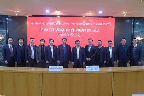 21日,中国十七冶集团与中国建设银行广西区分行全面战略合作框架协议签订仪式在广西南宁举行。公司董事长喻世功与建行广西区分行行长胡昌苗分别致辞,公司总经理刘安义与建行广西区分行行长助理唐家健分别代表双方在框架协议上签字。