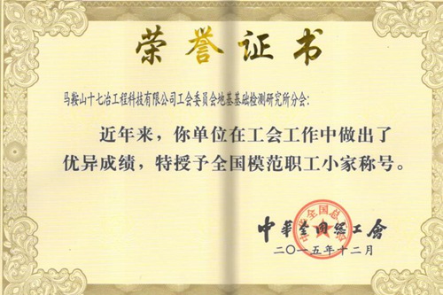 近日,十七冶工程科技公司工会委员会地基研所分会被中华全国总工会授予“全国模范职工小家”荣誉称号,这是继获得马鞍山市总工会、安徽省总工会授予的“模范职工小家”称号之后,再次受到中华全国总工会的褒奖。