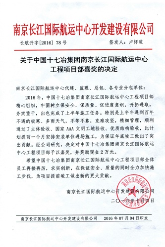 业主单位在嘉奖决定中指出:2016年,中国十七冶集团南京长江国际航运中心工程项目部精心组织,牢固树立保安全、保质量、促进度意识,开拓进取,务实重干,出色完成了上半年施工任务。特别是上半年遇到百年不遇的极寒、多雨天气,不等不靠,攻坚克难,精细管理,顺利通过了主体验收、国家AAA文明工地验收、优质结构验收,比计划提前一个月安排安装单位进场施工,为保证年底竣工做出来突出贡献。