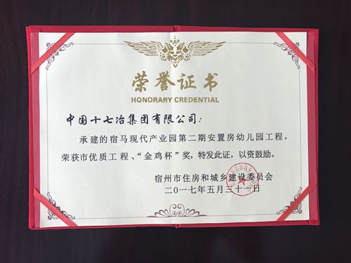 近日,从宿州市住房和城乡建设委员会获悉,由中国十七冶集团房屋工程技术公司承建的宿马二期安置房项目幼儿园工程被评为宿州市优质工程“金鸡杯”奖。