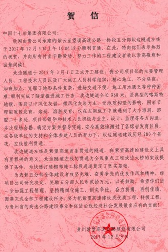 12月5日,贵州紫望高速公路建设有限公司向中国十七冶集团发来贺信,祝贺由中国十七冶集团有限公司交通工程技术分公司承建的贵州紫望高速公路五分部坎边隧道左线胜利贯通,并对十七冶紫望高速公路建设者攻坚克难、奋勇争先的优良作风和精神给予了高度赞扬。