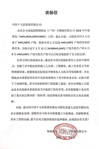 3月8日, 鞍钢联众(广州)不锈钢有限公司向中国十七冶集团发来表扬信,对工程技术服务分公司鞍钢联众2018年年修统包(HAPL/RAPL/ARP1/ARP2)工程项目管理团队表示感谢。