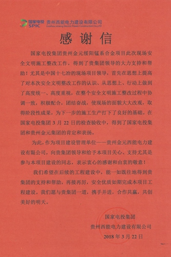 感谢信中表示,在中国十七冶集团的大力支持和帮助下,贵州绥阳锰系合金工程项目的安全文明施工取得了阶段性成果,为下一步的施工生产打下了良好的基础。感谢信对十七冶领导的关心和支持和参与项目建设员工的辛勤付出,表示衷心的感谢和由衷的敬意。
