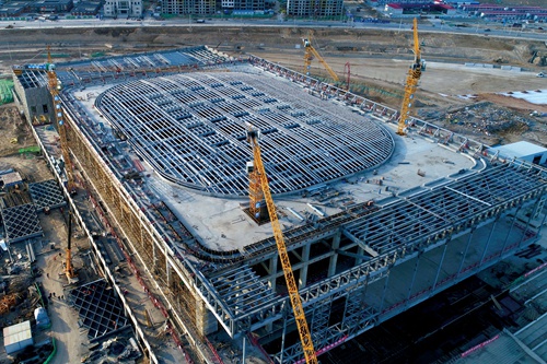 在甘肃省体育馆建设过程中,公司积极开展技术创新,大量使用小机器人、二维码、BIM等新技术,不断创新施工方法,收到了良好的效果。屋面桁架摒弃了传统的大吊车分段吊装方案,而是在空中散件拼装,由小机器人牵引将桁架向前整体滑移,结构整体到位后,拆除滑道,安装弹性支座,实现就位。此项施工技术为大型场馆大面积钢结构屋面施工提供了便捷,不仅大大提高了施工效率,还减少了施工安全隐患。