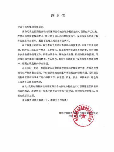 泗县致和新农村建设投资公司向十七冶致感谢信