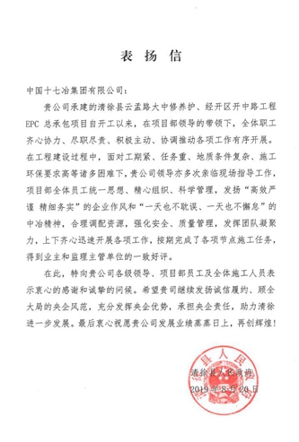 8月20日,山西太原清徐县人民政府向中国十七冶集团有限公司致表扬信,对公路工程技术分公司承建的清徐县云孟路大中修养护、经开区开中路工程EPC总承包项目给予了高度肯定与表扬。