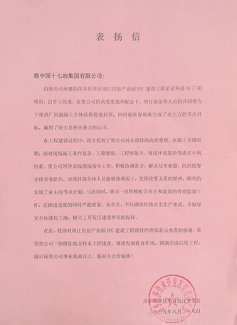 829日,萍乡经济技术开发区管理委员会向中国十七冶集团致表扬信,对公司在周江信息产业园EPC工程项目上所作的贡献给予了高度赞扬。