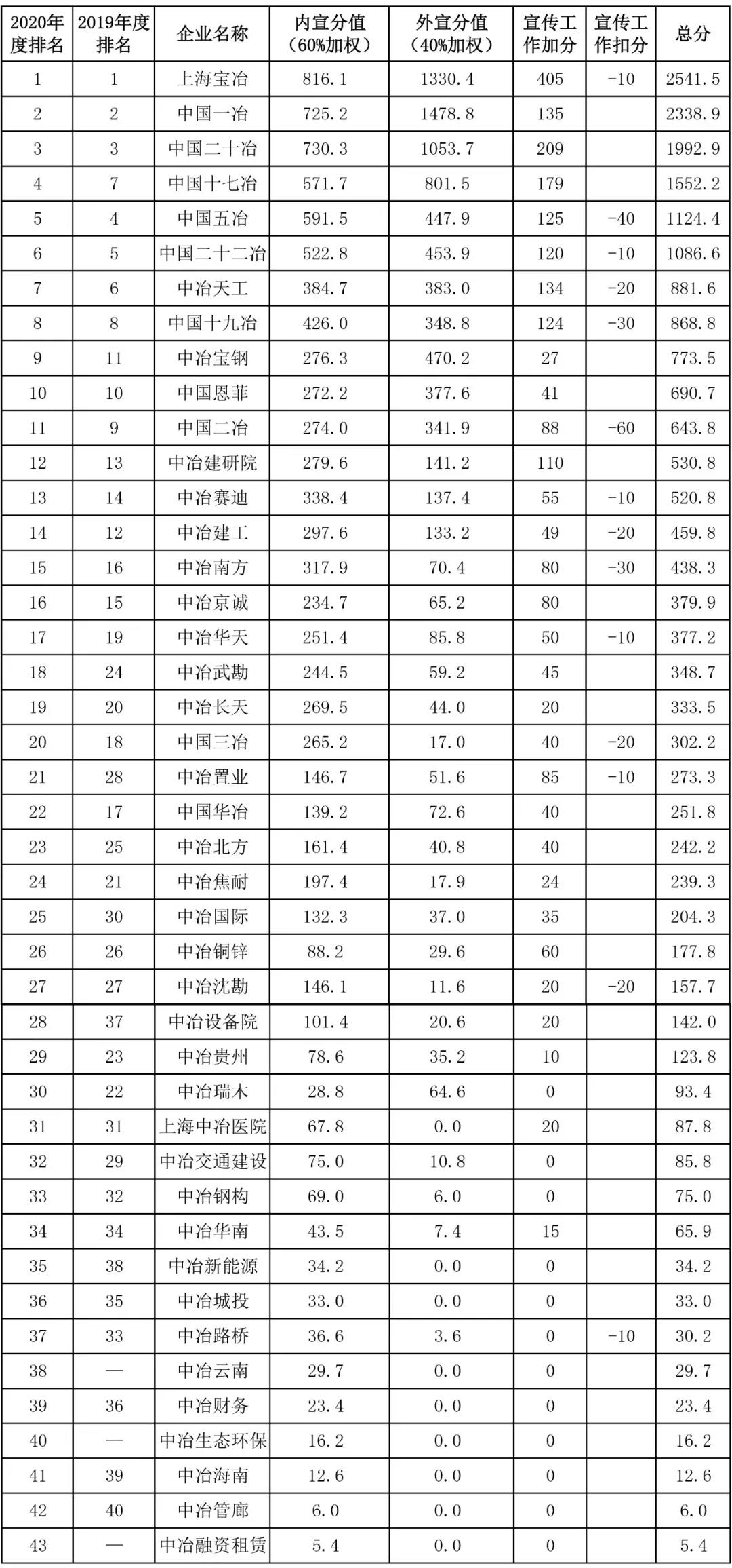 2020年度中冶集团子企业宣传工作评分排名