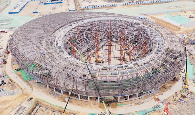 最新监测数据表明,综合管的滑动支座径向和环向位移最大值为21毫米,满足设计限值50毫米的要求;支座最大转角为0.01rad,满足0.02rad限值要求;穹顶结构控制点竖向位移最大为69毫米,与设计理论值吻合;穹顶结构对称点竖向位移最大差值为9毫米,远小于20毫米限值要求。所有对称位置索力均匀分布,穹顶结构整体稳定性良好,为接下来穹顶之上金属屋面及之下30吨斗屏的安装创造了极为有利的条件。