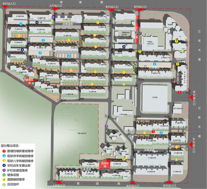 马鞍山市花山区桃源路和湖东路街道老旧改项目涵盖新岗二村、三村、马建小区、中岗小区、矿山新村五个小区,总占地面积28.22万平方米,涉及7139户居民,以及牡丹园、杏园、师苑、湖东路三村等7个小区外立面和配套设施的改造。