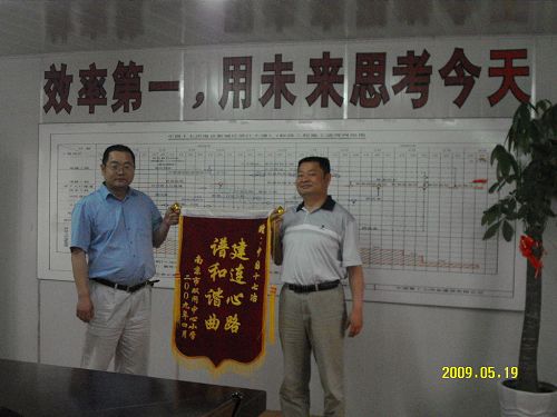519日下午,南京市双闸中心小学校长曹荣成等校领导来到十七冶南京滨江大道1.1标项目部,向十七冶南京滨江大道项目部赠送一面绣有“建连心路,谱和谐曲”八个金色大字的锦旗,并代表全校二千名师生向项目部一年来对该校师生各方面的关心、帮助表示感谢!