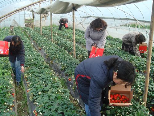 站在当涂西塘村旁,看着一座座园艺大棚里挂果的草莓,兴致勃勃的女工手拿果盒站在地沟边,开始了你追我赶的摘草莓比赛。