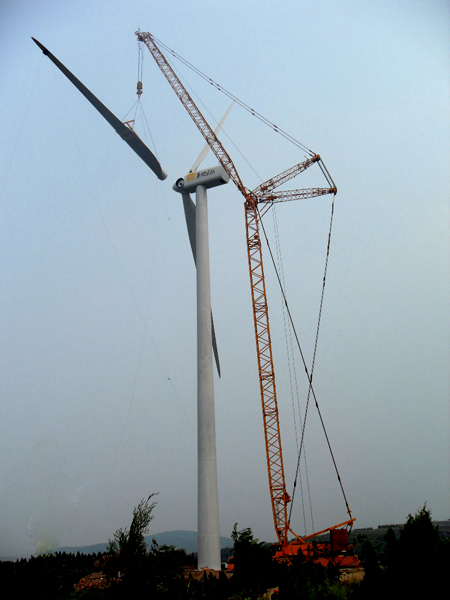 77中午12点,由风力发电工程技术公司承建的山东蓬莱大柳行风电工程第23号风机,当650吨吊车吊起的最后一片风叶与叶轮平稳对接后,宣告该项目第一台风机吊装成功,并确保了网络节点。