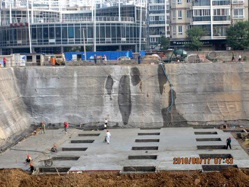 金融中心地下室底板总面积17000平方米,按子项划分为ABC三个大区和一个行政服务楼区。此次浇注的垫层位于金融中心深基坑的西北角,面积约1100平方米。垫层开始浇注,拉开了地下结构施工的序幕,为确保春节前地下室施工到地面创造了条件。