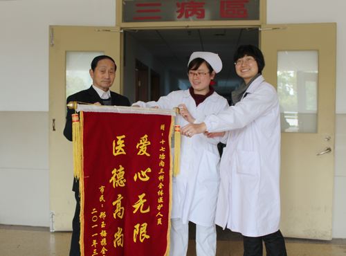 3377岁的邢玉梅因老慢支肺气肿、冠心病、肺病、心衰等疾病又住进了十七冶医院三病区。老人因年老体弱,病情多次出现恶化,经主任麻继锋和医生陈杰锋、程云凤等医护人员的全力救治,老人几次都转危为安。318,老人为了表示她的感激之情,让家人送给麻继锋主任和医护人员800元钱。麻主任再三推辞不掉,只好通过院部将钱退还给了老人。老人实在过意不去,就让家人订制了一面锦旗送给三病区全体医护人员。