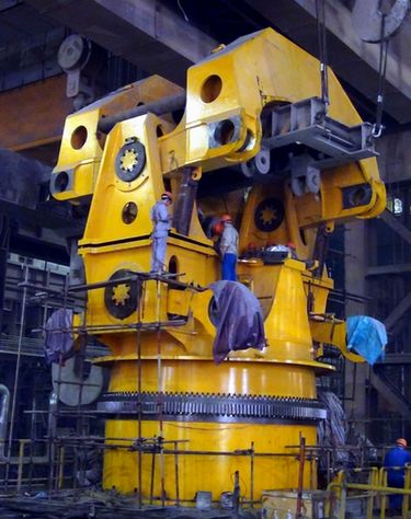 马钢四钢轧连铸项目大包回转台直径5.52米,回转半径6.5米,高10.6米,提升高度0.8米,本体自重334吨,设计年产量240万吨。该设备顶部结构距离行车梁下沿不到一米,是该项目设备安装中难度最大的一项内容。为了安全、科学地完成吊装任务,项目部会同作业处科学组织,优化施工方案,采用双行车分段抬吊就位的方法,顺利完成安装任务。