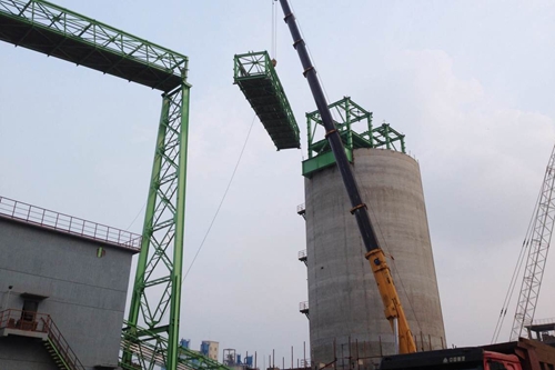 K112通廊共计8榀通廊,8榀支架,自K-5转运站通向仓顶转运站+39.97m钢平台,水平跨度165m,其中第8榀通廊长度28.3m,起吊高度43.5m,单重约27t。为确保通廊青奥会前顺利贯通,冶金公司组织全体参战人员于8月9日完成了K112通廊4-6榀通廊以及支架A16-1安装,11日完成K115通廊安装,为电气电缆敷设提供有利条件。冶金公司全体人员一刻也不懈怠,以实际行动践行着“高效严谨、精细务实”的企业作风,克服连续阴雨、场地狭小等诸多不利因素,统筹安排,精细化管理,在青奥会前顺利贯通了K112通廊。