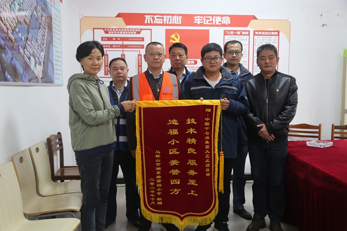 10月20日上午,马鞍山市湖东路第四小学校长裴筠及湖东路街道南湖社区委员会代表分别将两面印有“技术精良服务至上 造福小区美誉四方”“老旧小区改造新 党心连着聚民心”锦旗送到马鞍山大北庄老旧小区整治改造项目部,对十七冶团队为民办实事、解民忧表示感谢。