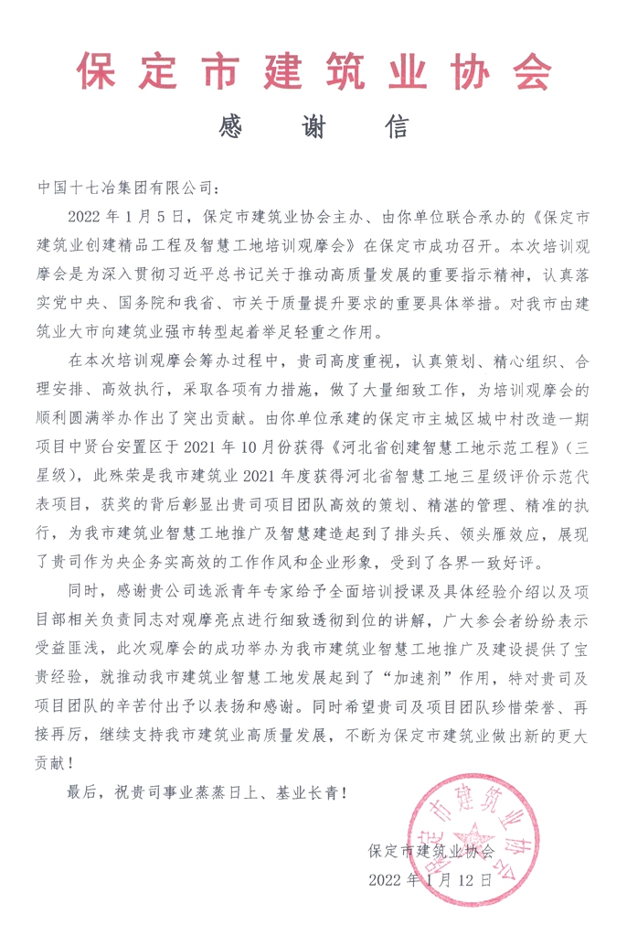 1月12日,保定市建筑业协会致信中国十七冶集团,表扬房屋分公司在承建的保定市主城区城改项目智慧工地创建中取得的优异成绩。