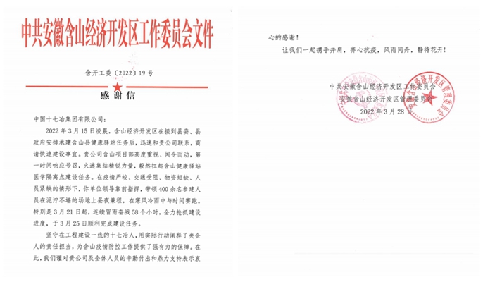 表扬信中提到,自接到健康驿站建设任务以来,项目部高度重视、闻令而动,第一时间响应号召,火速集结精锐力量,全力克服疫情严峻、交通受阻、物资短缺、人员紧缺等难题,组织400余名参建人员在泥泞不堪的场地上昼夜兼程,顺利完成建设任务,用实际行动阐释了央企人的责任担当,为含山疫情防控工作提供了强有力的保障。