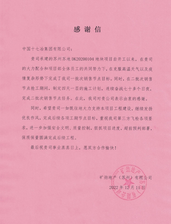矿劲地产(苏州)有限公司向十七冶致感谢信