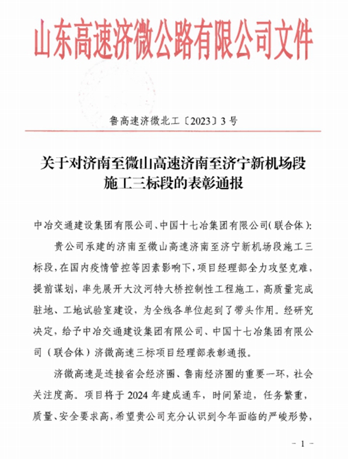 1月10日,山东高速济微公路有限公司向中国十七冶致表彰函,对交通分公司山东济微高速三标项目团队攻坚克难、真抓实干、取得佳绩的表现予以表彰通报。