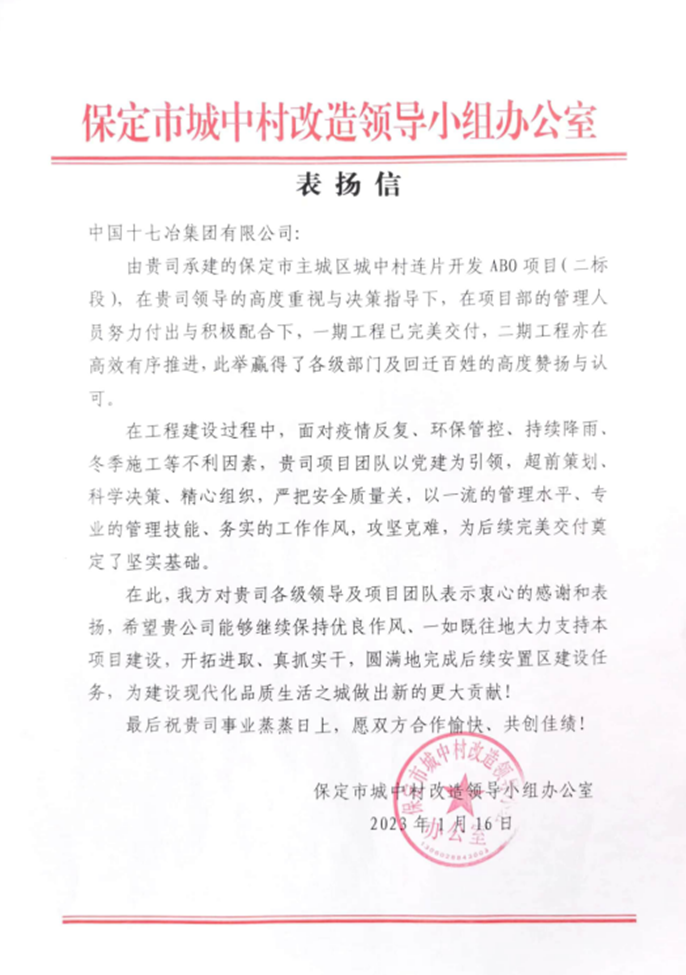 近日,保定市城中村改造领导小组办公室授予中国十七冶集团“突出贡献单位”称号并致表扬信,对房屋分公司保定市主城区城中村连片开发ABO项目二标段团队,为确保一期工程完美交付、二期工程高效推进所作努力予以高度赞扬与衷心感谢。