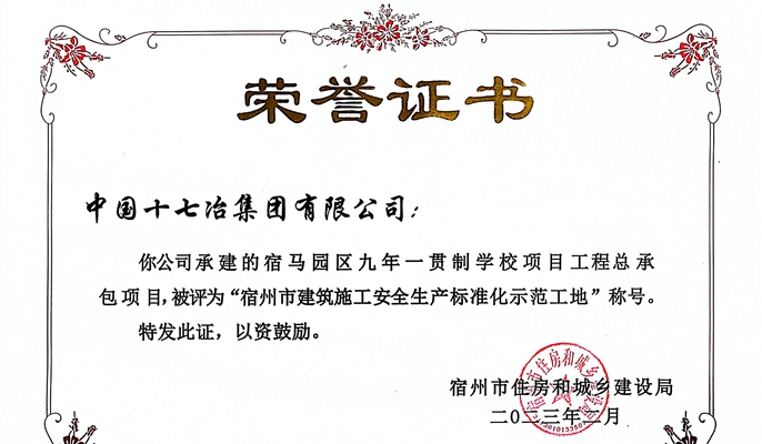 近日,中国十七冶房屋分公司承建的宿马园区九年一贯制学校工程总承包(EPC)项目荣获“宿州市建筑施工安全生产标准化示范工地”称号。