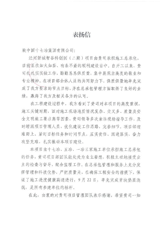 十一前夕,陕西西咸新区泾河新城城市建设投资有限公司向中国十七冶集团致表扬信,对陕西分公司泾河新城智谷科创园项目团队克服困难,率先完成既定节点表示肯定与感谢。