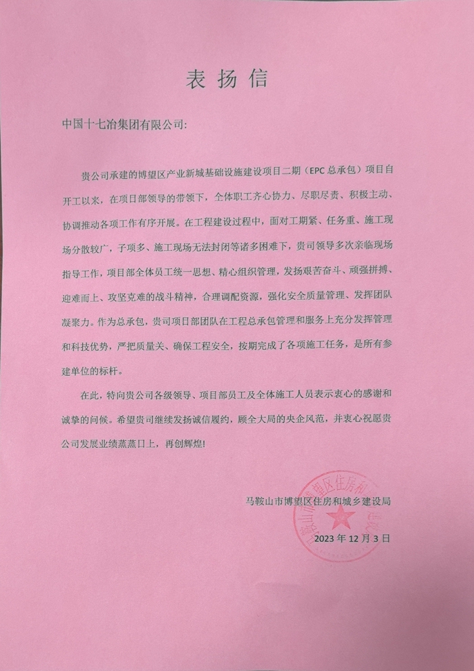 12月3日,马鞍山市博望区住房和城乡建设局向中国十七冶集团致表扬信,对工建分公司博望产业新城基础设施建设项目二期团队克服多种不利影响,高质快速推进工程建设提出表扬。
