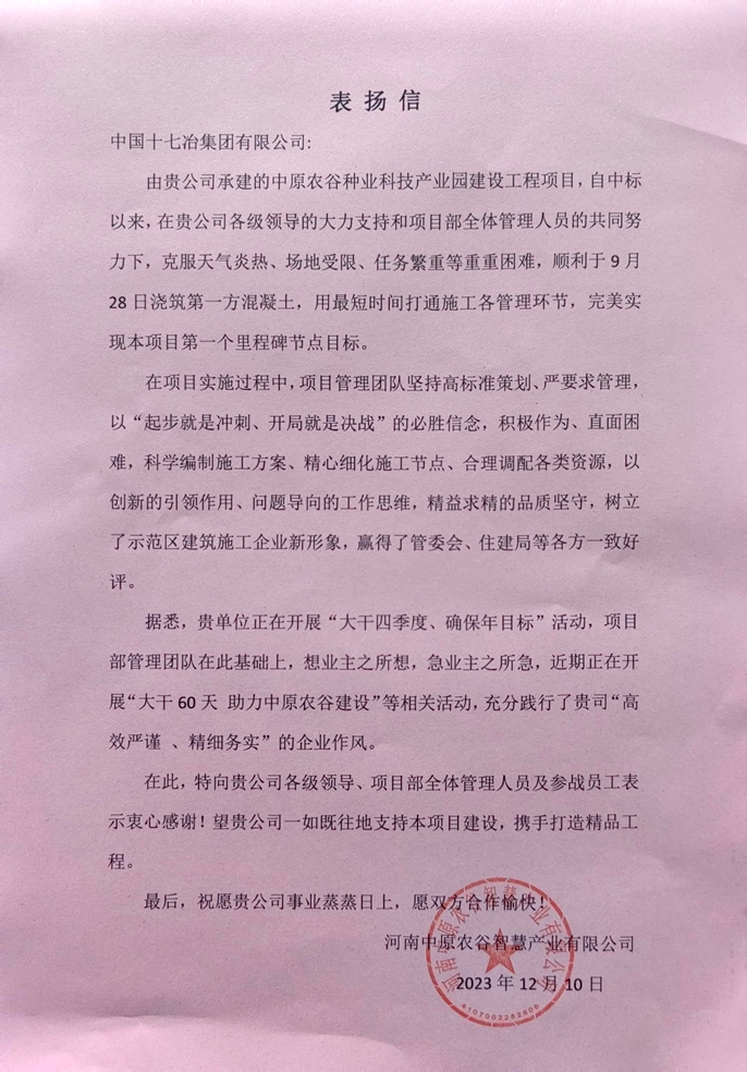12月10日,河南中原农谷智慧产业有限公司向中国十七冶致表扬信,对冶金分公司中原农谷种业科技产业园项目部高标准推进项目建设,打通施工管理环节,顺利实现节点目标提出表扬。