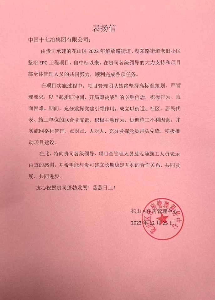 12月26日,马鞍山市花山区住房管理中心向中国十七冶致表扬信,对南京分公司花山区2023年解放路街道、湖东路街道老旧改项目团队于12月20日如期圆满完成各项改造任务提出表扬。