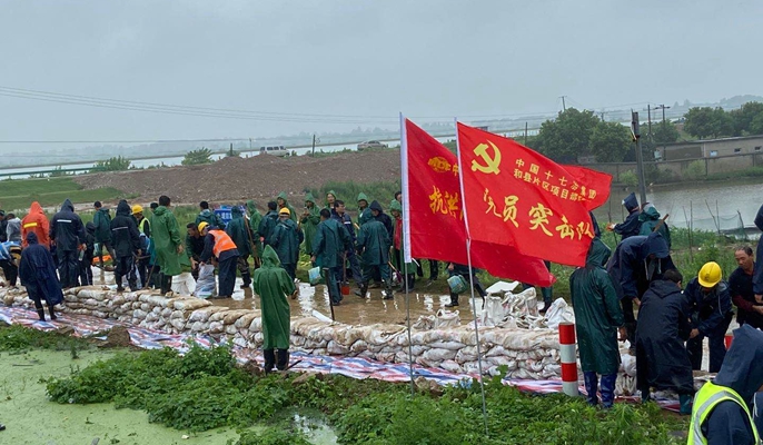 2020年安徽区域防汛形势异常严峻,公司闻令而动,主动担当。防汛抢险以来,先后投入2000余人次到防汛抗洪工作中,装沙袋、筑堤坝、堵渗点、排查险情,克服机械材料等运输困难,协助当地政府部门打响了多项防汛关键性战疫。38℃高温闷热的环境下,防汛现场人人挥汗如雨,拿起编织袋、铁秋,装砂石的装砂石,运沙袋的运沙袋,齐心协力,众志成城抗击洪水,和水位比高度,与洪峰比速度,不断加高加固圩堤,有效抵御了高水位的浸泡强压,防止堤坝塌方。