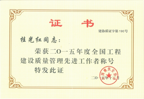 近日,中冶置业(安徽)公司总工程师、副总经理桂光红收到中国建筑业协会颁发的“2015年度全国工程建设质量管理先进工作者”荣誉证书。