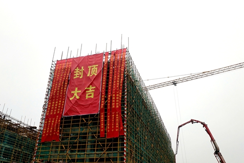 工程工期紧、任务重,项目部发扬“一天也不耽误、一天也不懈怠”的工作精神,制定“赶工措施施工方案”,增加人力物力,在确保安全与质量的前提下,积极推进施工进度,实现了此次封顶,为后续节点的实现创造了条件。