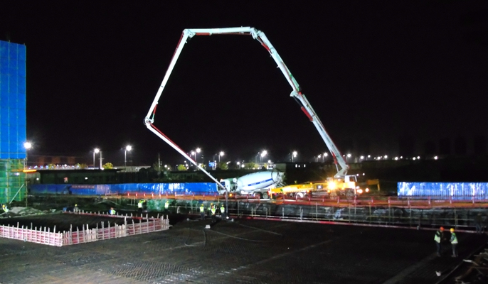 3月29日上午,中国十七冶集团承建的安徽颍上县东城水岸花园一期工程2.6万平方米中心大地库,13个分区最后两区的H区顶板砼浇筑,在连夜激战14小时后,披着毛毛细雨合拢“收官”。