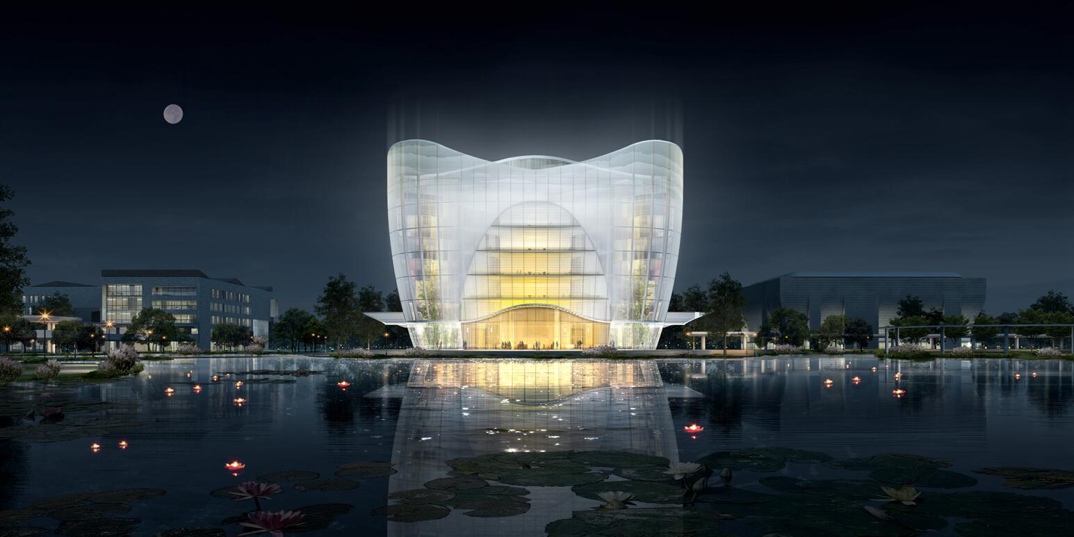 马鞍山幼儿师范学校新校区项目建设地点位于安徽和县历阳镇城西,禹锡南路西侧大周村,总建筑面积124980平方米,其中地上建筑面积119080平方米,地下建筑面积5900平方米。图书馆位于校园核心区域,位于南入口和东入口两大校园主入口的实现交叉点,同时也成为两个入口的对景建筑。图书馆建筑临水而建,是整个校园水面视觉中心,建筑高度38.5米,是整个校园的标志性建筑。