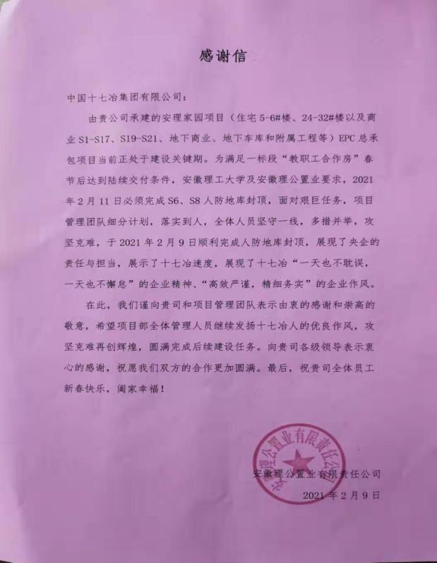 2月9日,安徽理公置业有限责任公司致信中国十七冶集团,对中国十七冶集团及安理家园项目管理团队表示感谢。