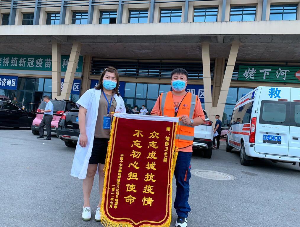 8月9月,中冶置业(安徽)公司郑蒲港片区项目向郑蒲港新区管委会与郑蒲港姥桥卫生院赠送锦旗。两面写有“炎炎夏日送清凉 丝丝关爱暖人心”“众志成城抗疫情 不忘初心担使命”的锦旗,表达了十七冶人对管委会和卫生院在夏日送清凉活动及疫情防控给予温馨关怀与帮助的诚挚感谢。
