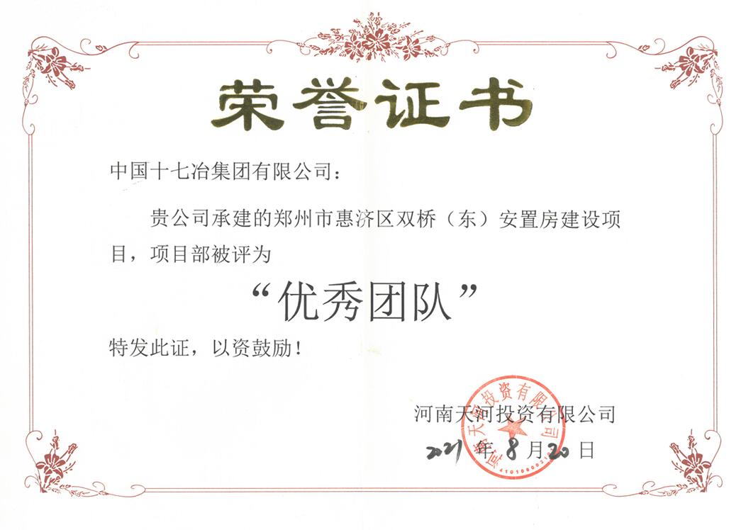 8月20日,河南天河投资有限公司向中国十七冶集团致表扬信,对中国十七冶集团郑州市惠济区双桥(东)安置房项目团队快速高效推动项目建设,取得了良好成绩表示高度肯定和表扬,并为项目团队颁发“优秀团队”荣誉证书。