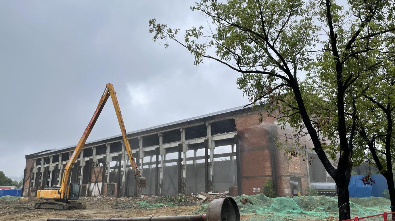 此次拆除的厂房为原合钢老厂,结构形式为单排混凝土排架、预制钢筋混凝土屋架,屋面采用钢筋混凝凝土大型屋面板结构,建筑面积4320.56平方米。由于厂房高度超过15米,体量过大,需保留部分墙面,项目部高度重视、群策群力,拆除现场通过警戒线及架设防护网隔离出安全区域,确保拆除任务安全、如期完成。同时以服务业主为宗旨,抢时间、抢进度,利用雨天解决环保降尘问题,圆满完成了此次拆除任务。